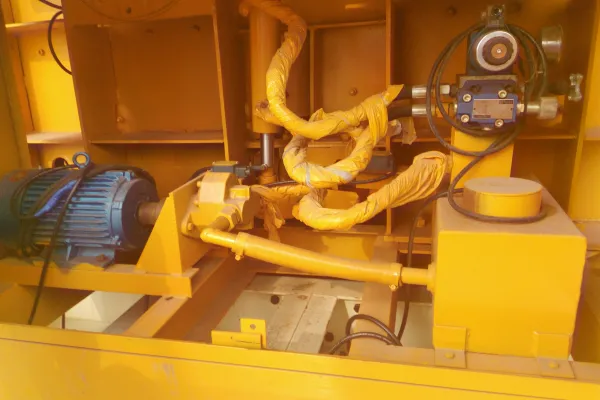 The concrete mixer produced by Jianxin is connected to the transmission mechanism via a shaft: the gear meshes with the gear ring installed on the cylinder body.